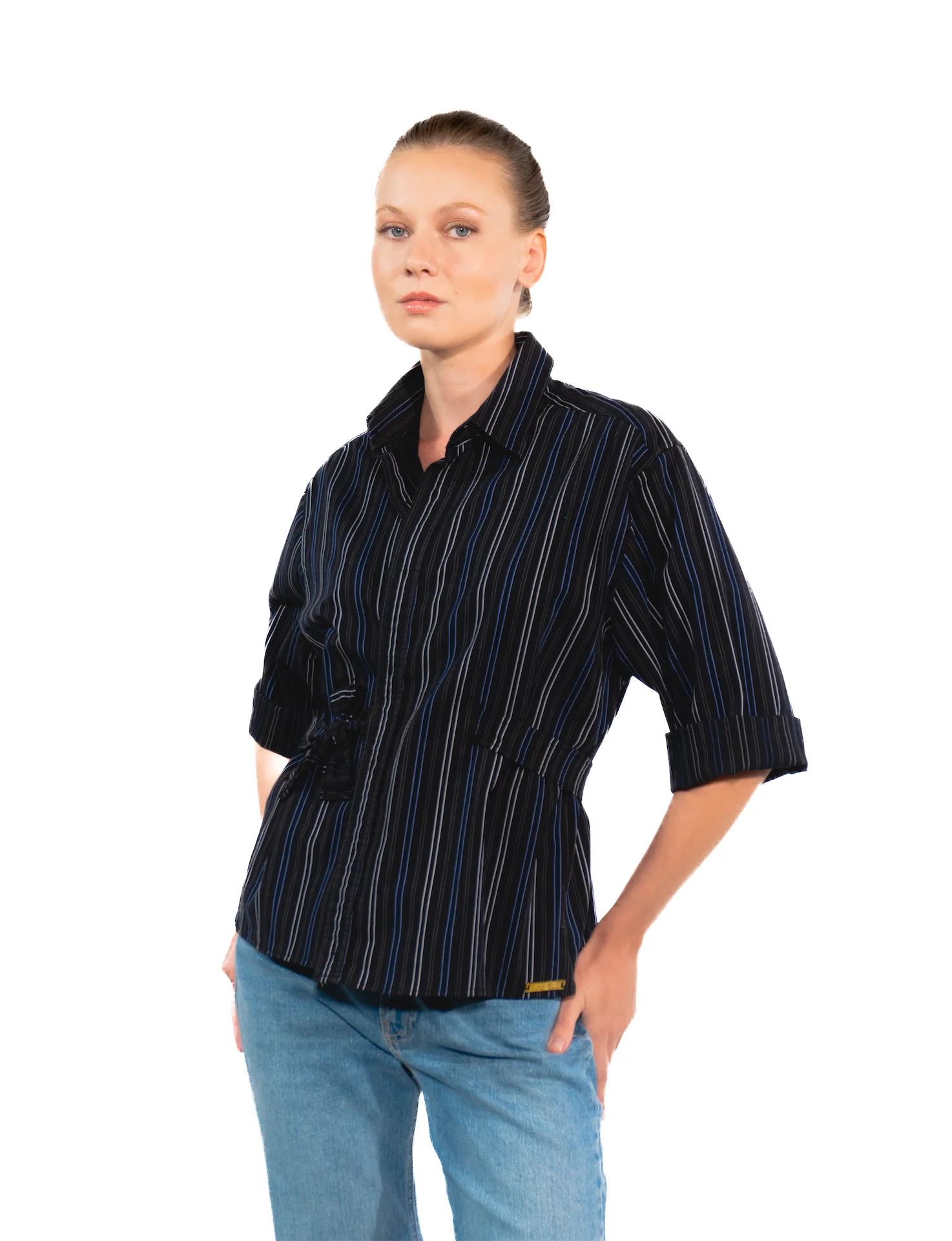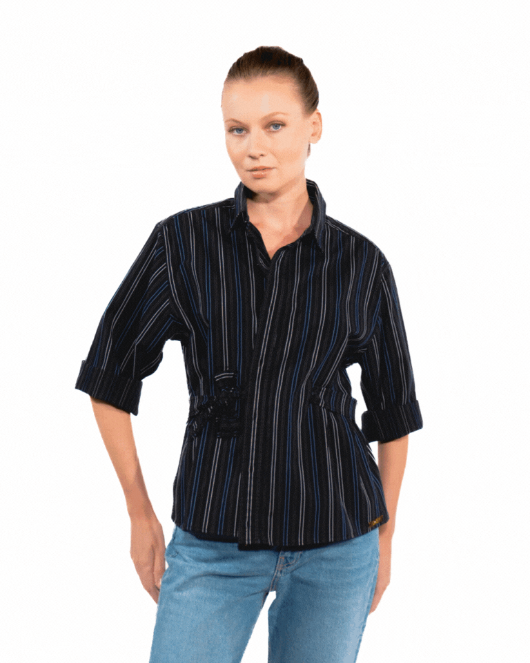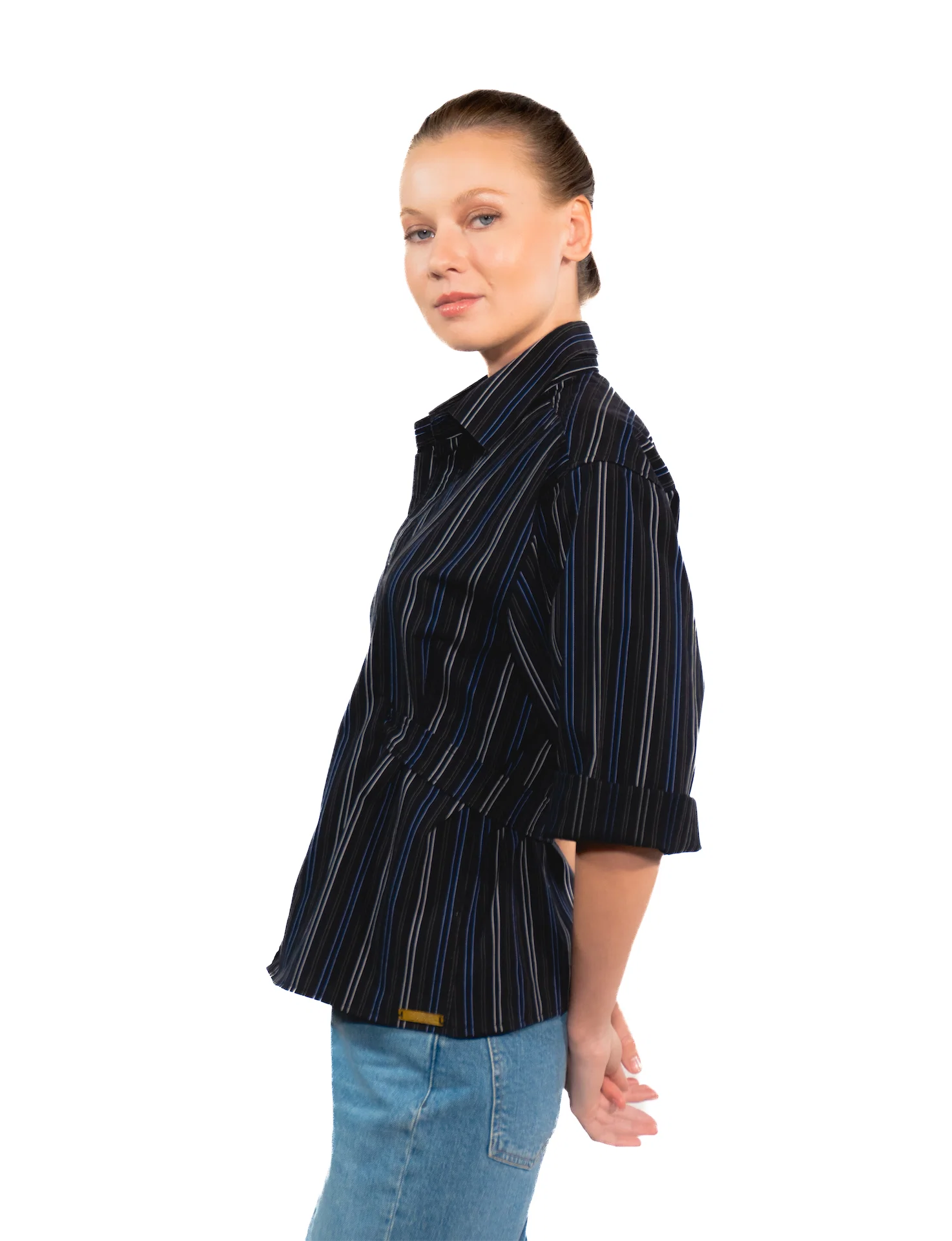 - Navy blue with light blue pinstripes and glossy marbled black buttons