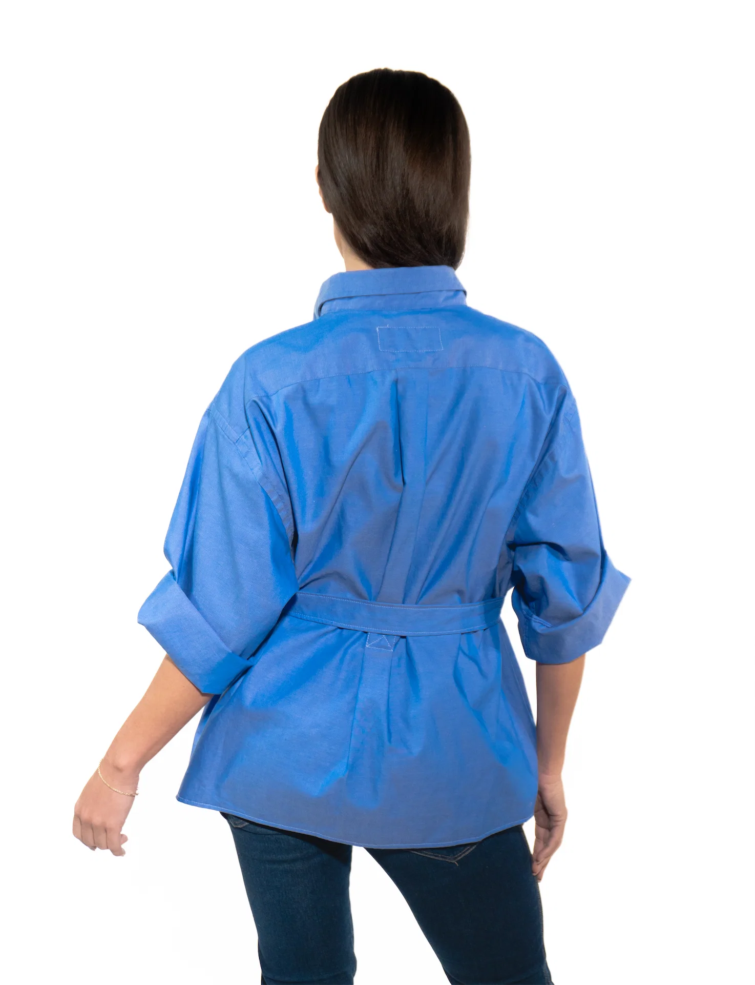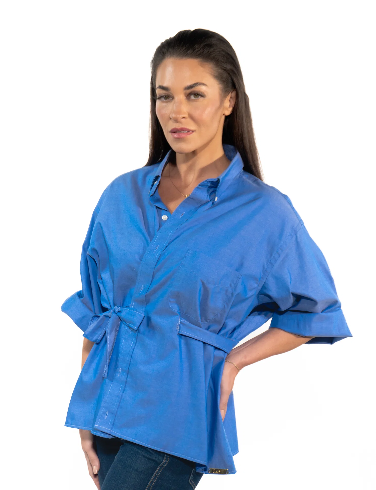 • Royal blue with button-down collar and glossy buttons