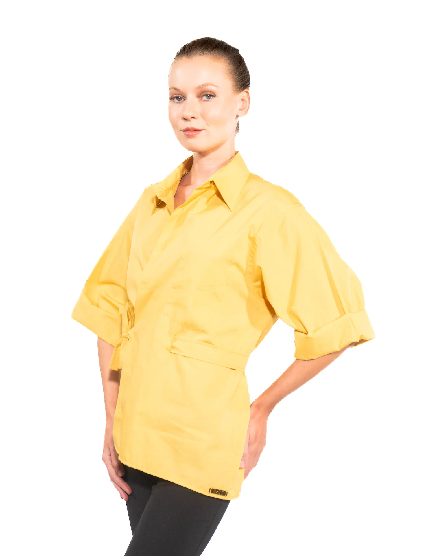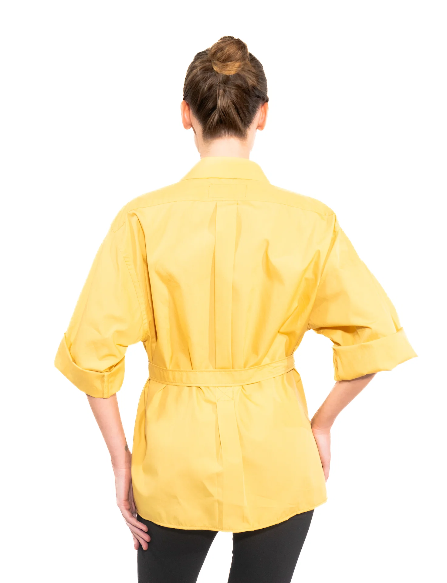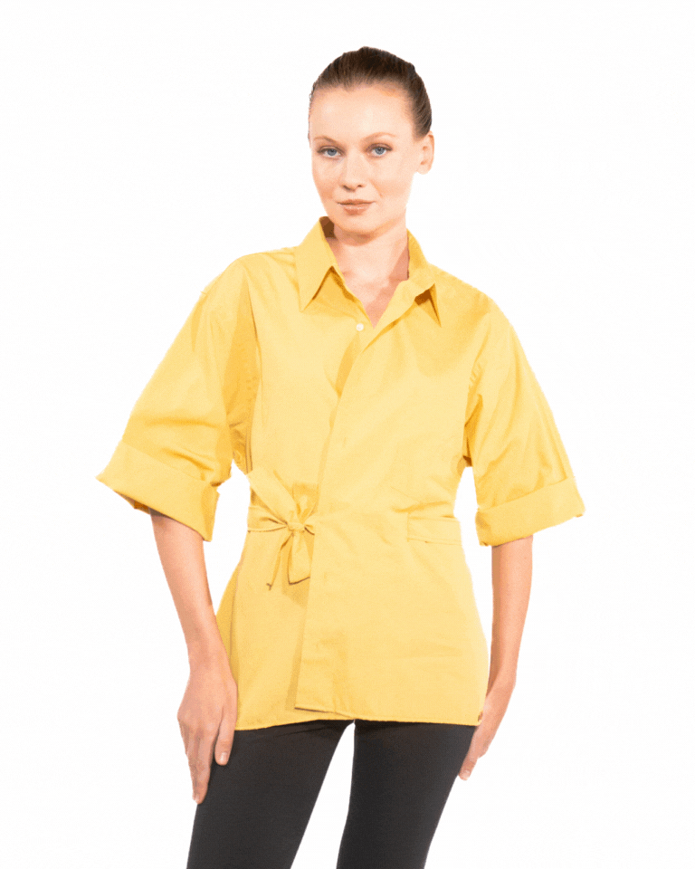 - Mustard yellow with glossy pearl buttons and chest pocket