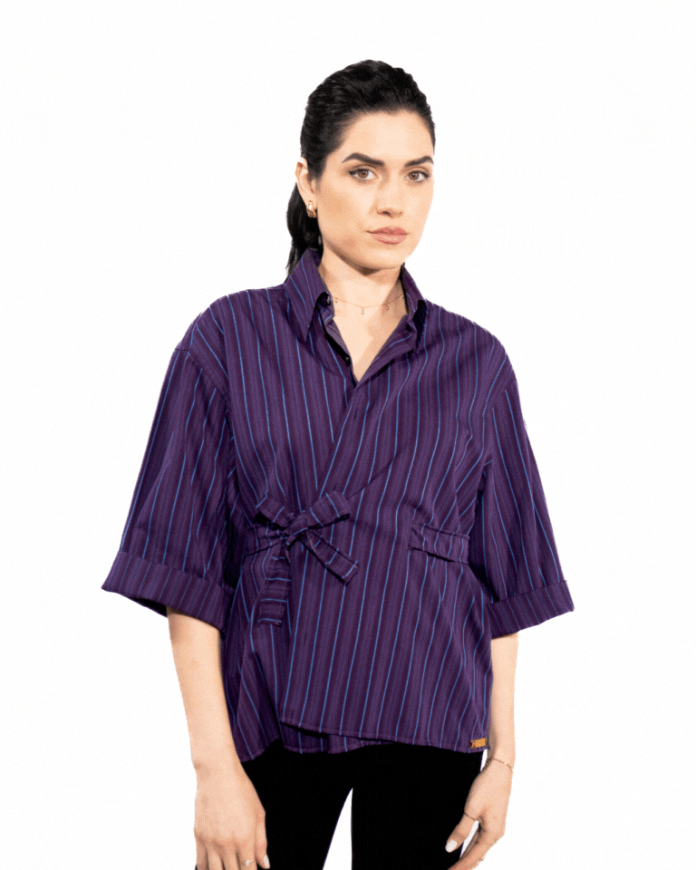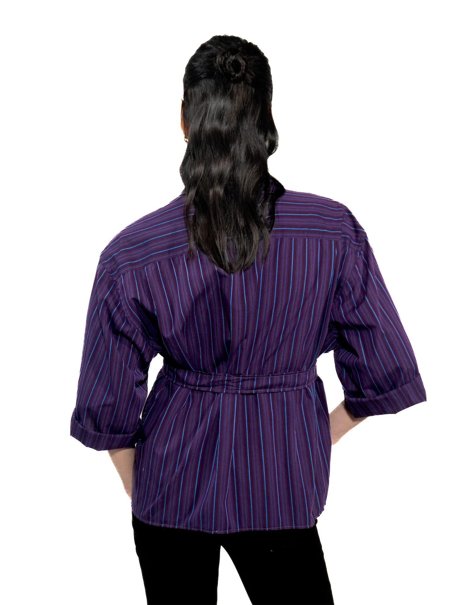 - Purple with light blue and dark purple stripes and glossy gray buttons