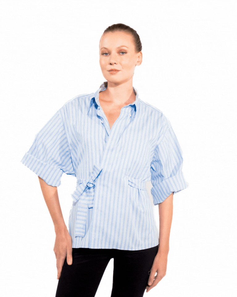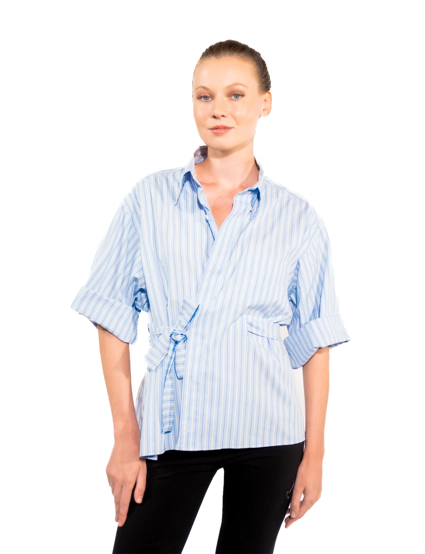 - Light blue with blue and white pinstripes and glossy pearl buttons